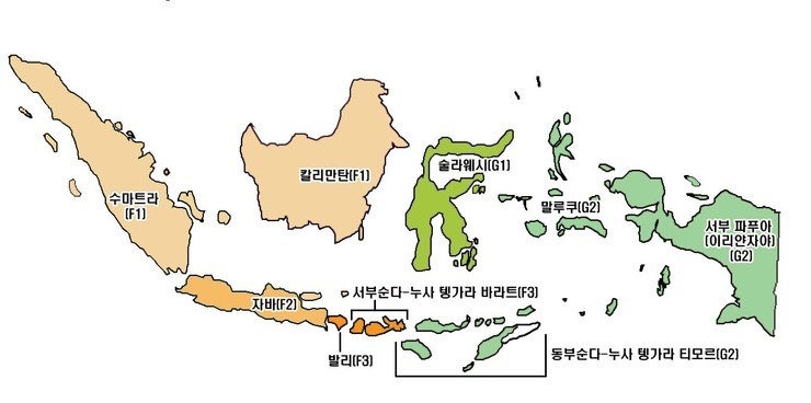 그 중 5개의 큰 섬으로 보루네오(칼리만탄), 수마트라, 슬라웨시, 빠뿌아, 자바 섬이며 그 외는 작은 섬들로 구성되어 있습니다.